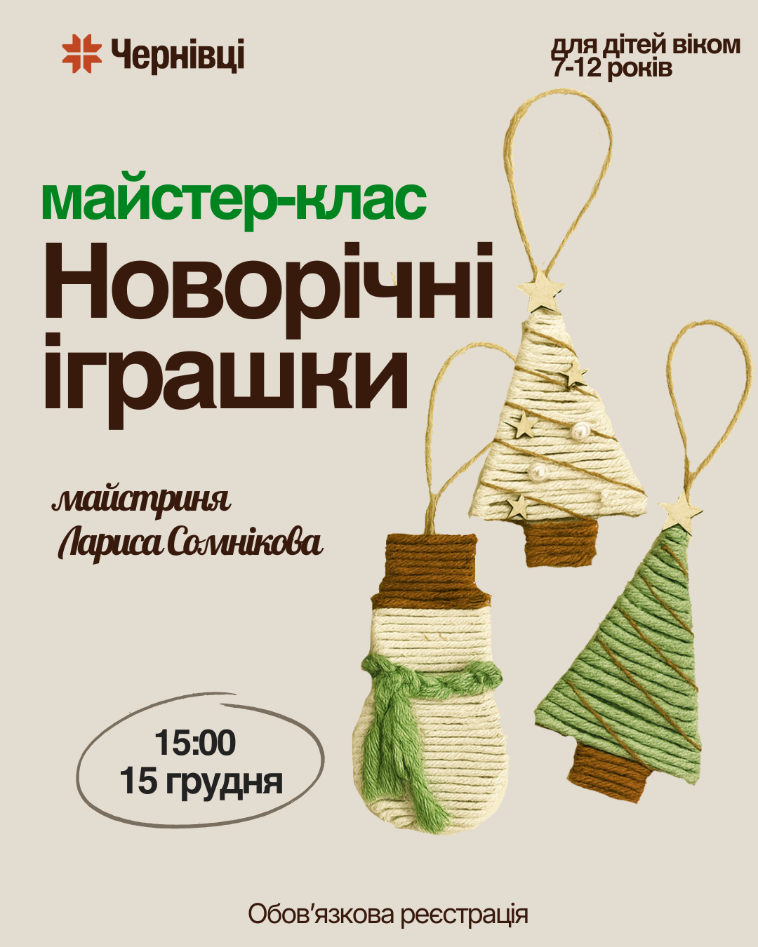 Творча зимова пригода для дітей 7–12 років. Майстер-клас зі створення новорічних іграшок разом із майстринею Ларисою Сомніковою. Реєстрація