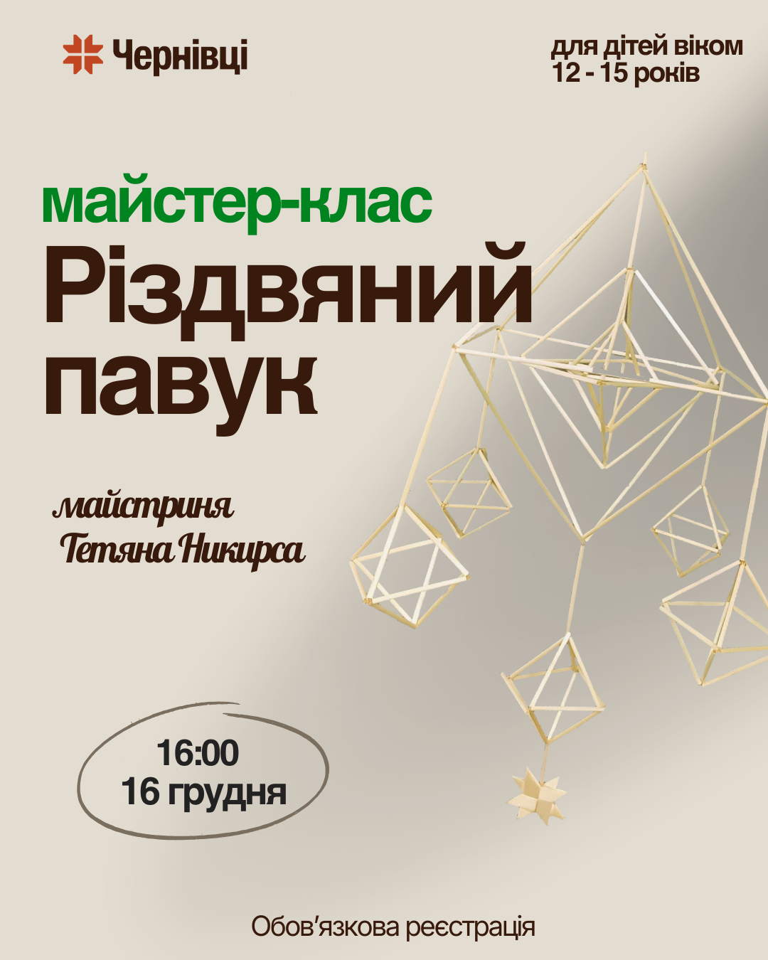 Майстер-клас зі створення традиційного українського символу — Різдвяного павука разом із Тетяною Никирсою. Доторкніться до справжньої народної традиції та створіть оберіг-оздобу для дому. Вік учасників: 12-15 років. Реєстрація