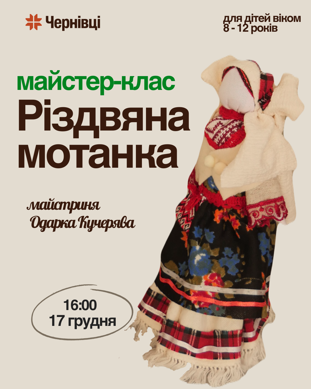 Майстер-клас «Різдвяна Мотанка у кожушку» з Одаркою Кучерявою. Створіть затишну обрядову ляльку, що несе в собі тепло традицій та дух Різдва.