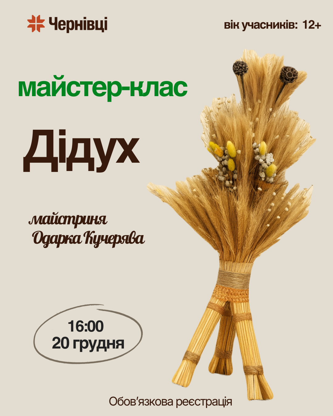 Майстер-клас «Дідух» — це можливість власноруч відтворити давній різдвяний символ та відчути справжній дух українських традицій. Проводить Одарка Кучерява.
