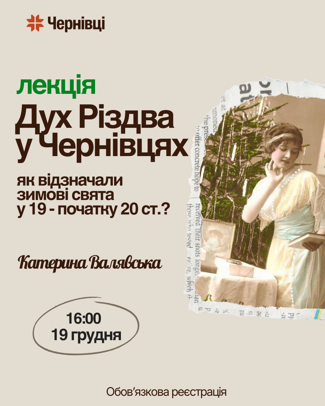 Лекція «Дух Різдва у Чернівцях». Катерина Валявська охоче розповість як відзначали зимові свята в міста у 19 та першій чверті 20 століття. Реєстрація