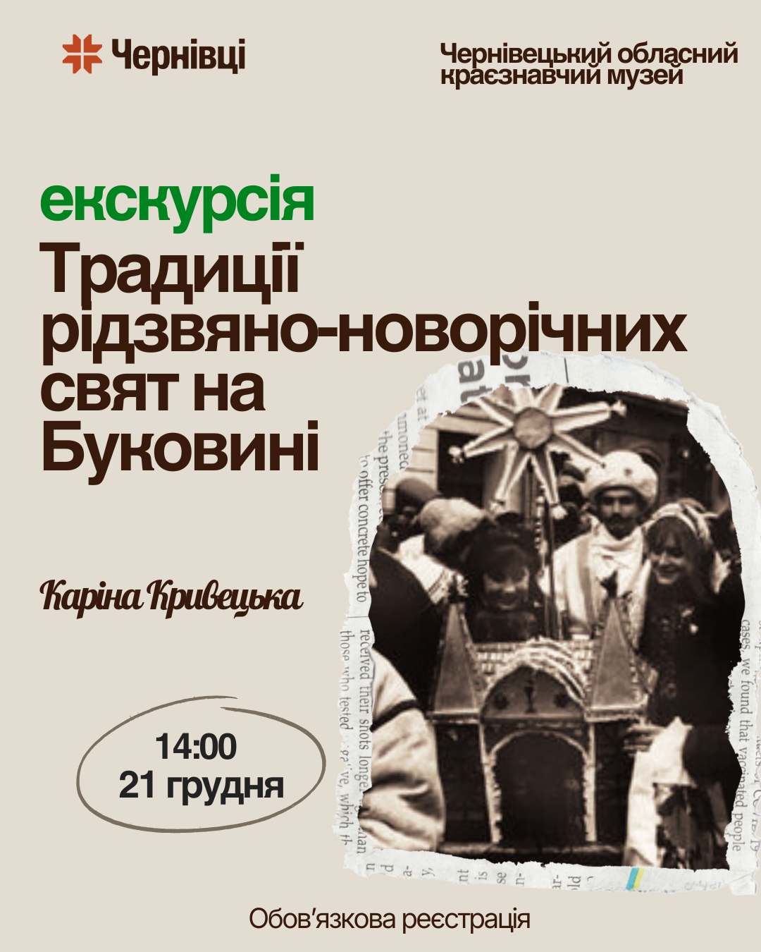Екскурсія «Традиції різдвяно-новорічних свят на Буковині» з Каріною Кривецькою. Відкрийте для себе магію зимових свят. На екскурсії ви дізнаєтеся про унікальні звичаї, традиції та обряди нашого краю: способи парубоцьких та дівочих ворожінь на долю та погоду; перевдяганні молоді на Маланку; обереги хати - павуки, дідухи, різдвяні зірки.