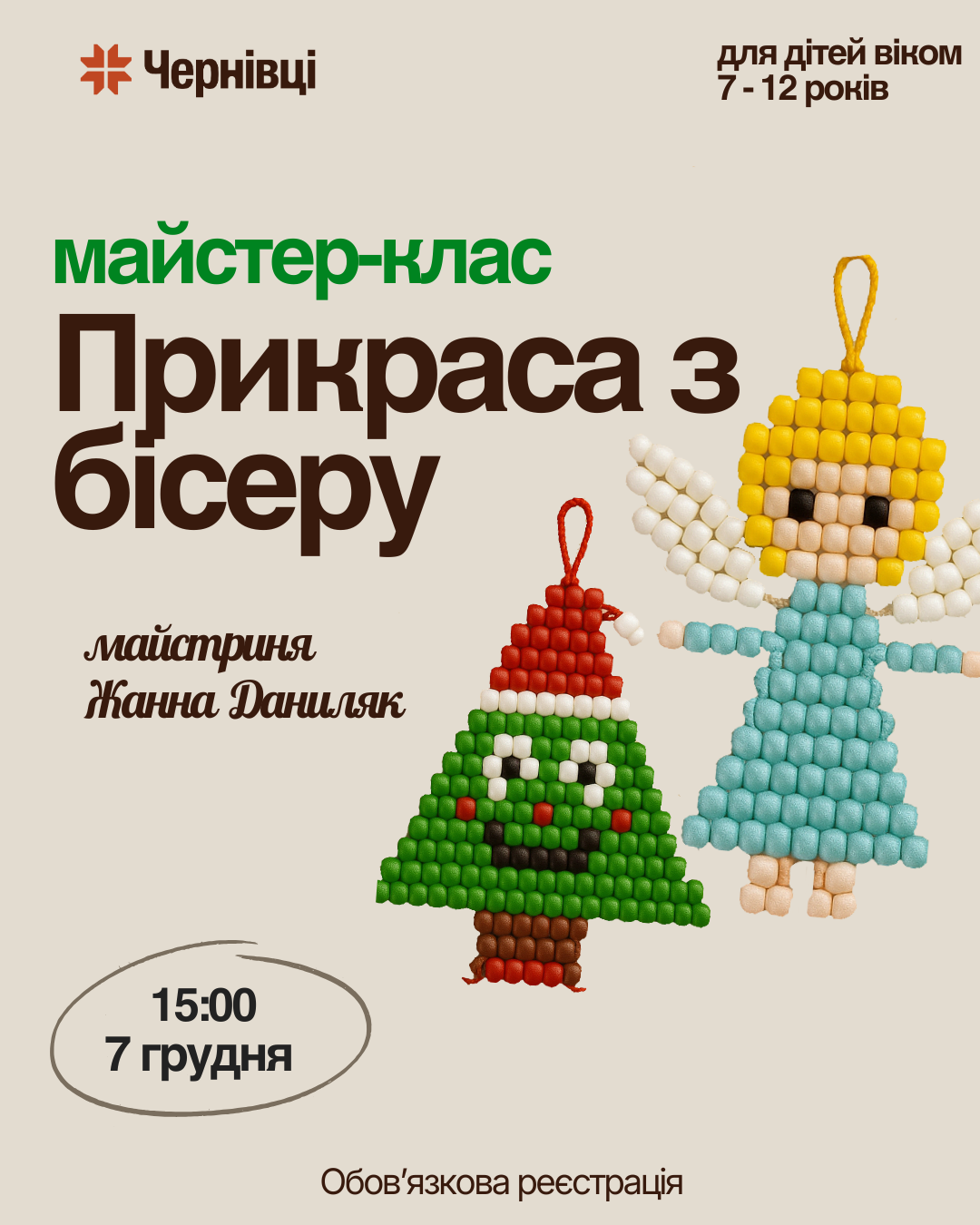 Під керівництвом майстрині Жанни Даниляк бісер оживе і перетвориться ніжну святкову історію, вплетену у новорічну прикрасу.