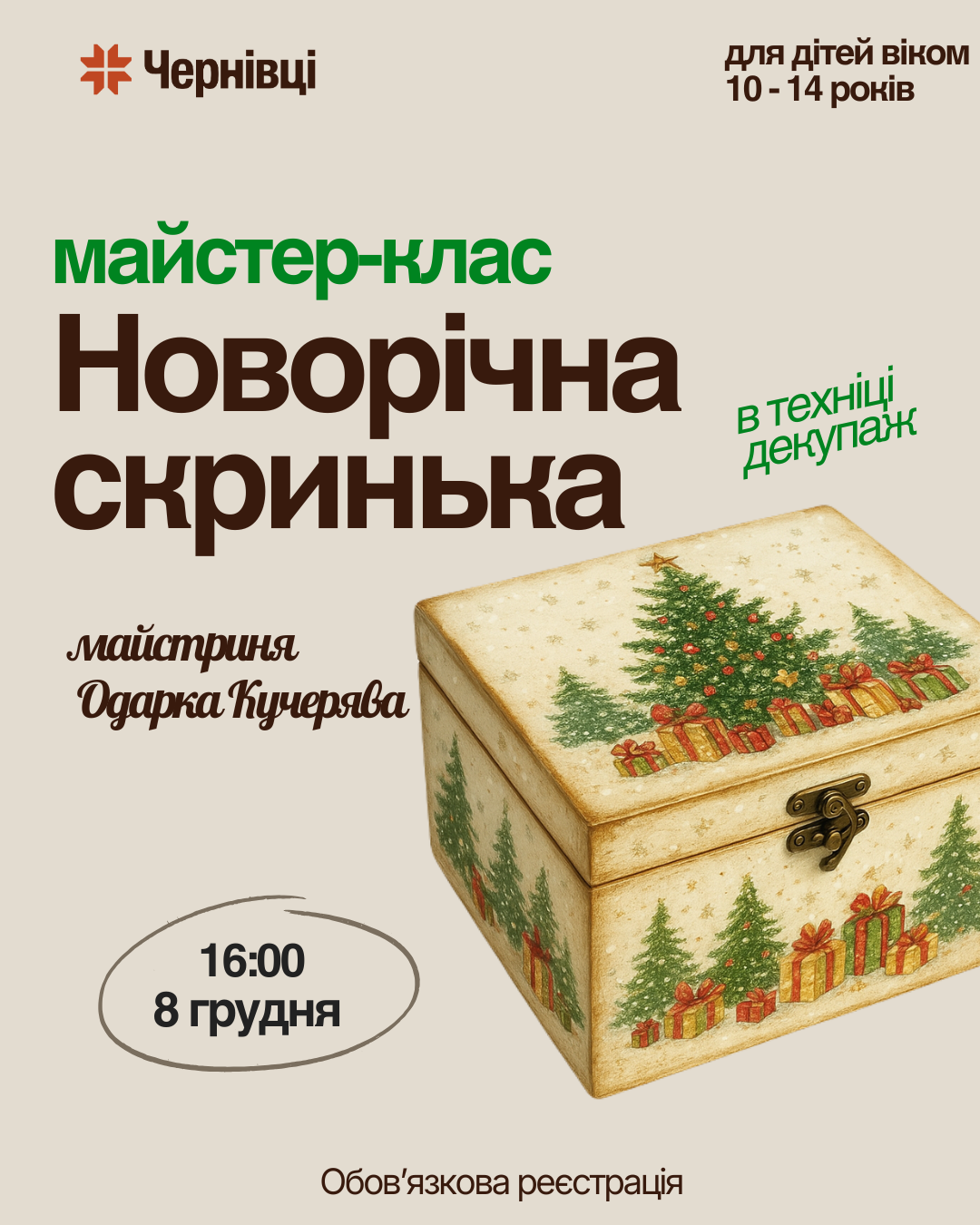 Мастер-клас із техніки декупаж під керівництвом майстрині Одарки Кучерявої. Створіть святкову скриньку, що зберігатиме найтепліші зимові спогади.