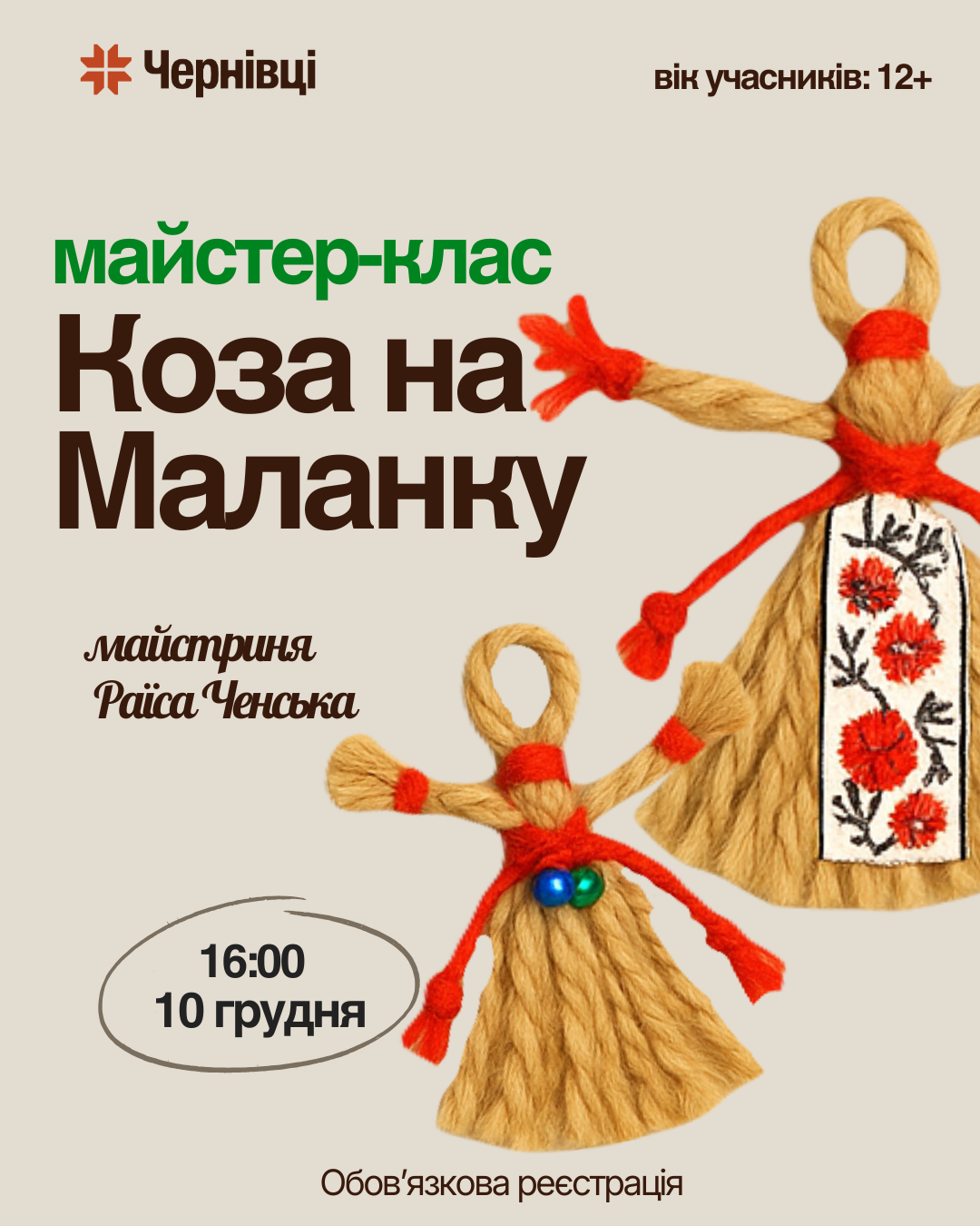 Водіння кози - давній обряд на свято Маланки. Дізнатися цікавинки про цю традицію і створити маленький святковий атрибут можна під час майстерки «Коза на Маланку». Майстриня - Раїса Ченська. Реєстрація